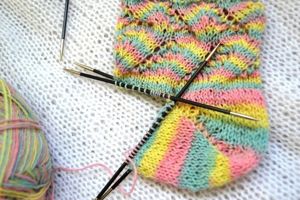 Вдоль данных краев набирают петельки, прибавляемые к петлям пятки, которые находятся на спице.