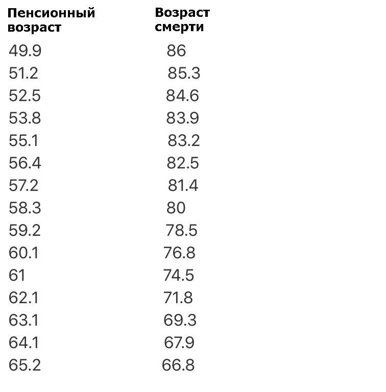 В этой статье приведены данные исследования, проведенного доктором Эфрем Ченг, ведущим американским ученым. Оно показывает взаимосвязь между ожидаемой продолжительностью жизни и возрастом выхода на пенсию. В исследовании было зафиксировано несколько пенсионных планов для супербольших групп жителей США, в том числе сотрудников Boeing, AT & T и Ford Motor Co. Установлено, что чем позже человек уходит на пенсию, тем короче его жизнь! Статистика следующая: Как видно из цифр, 15 лет работы украли 20 лет жизни. При этом, человек, который ушел на пенсию в 50 лет, не только доживает до 86 лет, но еще и не работает с 50 до 65 лет. То есть, он живет припеваючи 35 лет. А вот человек, выходящий на пенсию в 65, проживет после этого всего два года, проведя таким образом, всю жизнь на работе. Данные исследования показывают, что все сотрудники, которые вышли на пенсию в 65 лет, умерли в течение 18 месяцев! Зависимость понятна — чем позже вы выйдете на пенсию, тем раньше вы умрете. Люди, работающие п