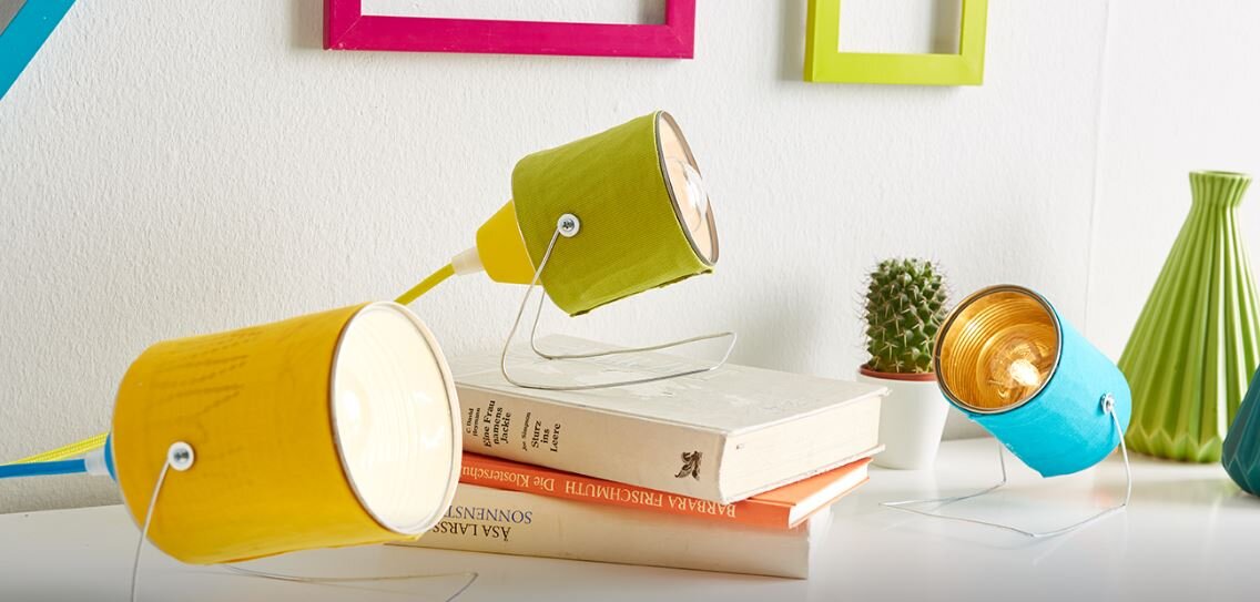 Консервные банки - удивительно практичный продукт. Они не только сохраняют нашу пищу в течение длительного времени, но и универсальны, даже, когда они пусты. Будь то держатель столовых приборов или органайзер для офиса , форма для выпечки небольших пирожных или цветочный горшок , возможности безграничны. А так как освещение всегда было очень важной темой в меблировке, сегодня мы делаем модные светильники из наших старых консервных банок. И вот, что вам нужно: И вот я сделала лампы из консервных банок: В начале, отверстие (с соответствующим диаметром для цоколя лампы) выпиливается из нижней части банки с помощью кольцевой пилы. Вы должны работать очень осторожно и носить рабочие перчатки, так как края могут быть очень острыми! Затем из куска ткани или даже остатков обоев пометьте корпус банки и вырежьте его. Закрепите с помощью горячего клеевого пистолета. Чтобы позже можно было прикрепить основание к коробке, я использовала винт с шайбой с обеих сторон. Основу я согнула из куска п