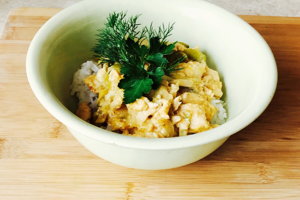 Нежное куриное филе в кисло-сладком соусе с яйцом и луком пореем.