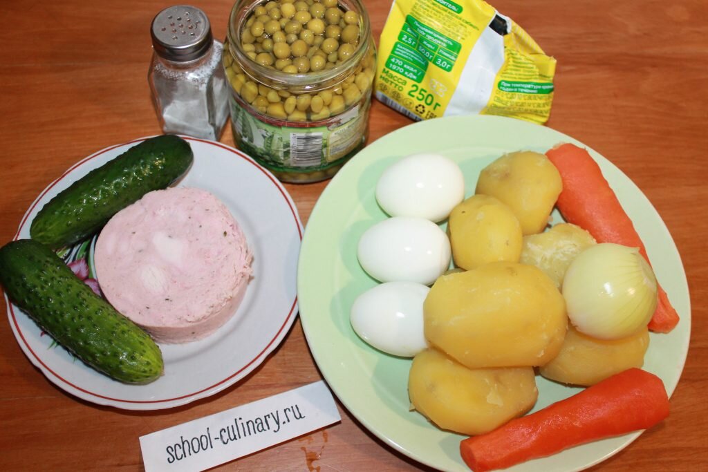 Первым делом нужно отварить и остудить картофель с морковью, а также яйца. С горошка слейте жидкость. Подготовьте остальные ингредиенты.