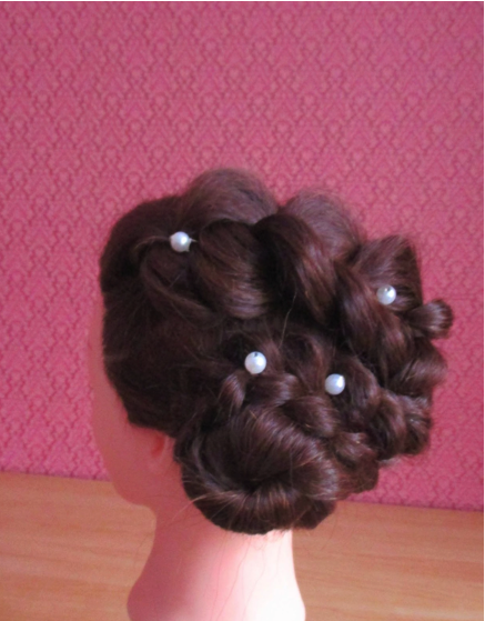Скручиваем волосы из хвоста в пучок, который закрепляем шпильками.