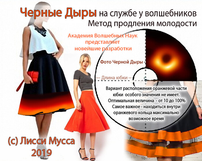 Мировая сенсация: ученым-астрофизикам удалось наконец сфотографировать черную дыру из созвездия Девы! И это побудило многие академии мира начать всевозможные работы по исследованию и практическому применению этого уникального феномена. Академия Волшебных Наук не осталась в стороне и вот мы предлагаем вашему вниманию небольшой фрагмент "Трактата о Черных Дырах", который сейчас готовится нашими сотрудниками к публикации. Итак: Ученые исследовали именно созвездие Девы на наличие черной дыры, и именно в этом созвездии черная дыра и была обнаружена и даже сфотографирована. Сие звучит несколько двусмысленно, но мы не станем опускаться до юмора уровня нижних чакр, и продолжим: Чем же Дева отличается от прочих? Безусловно - наличием юбки! Ни один знак зодиака не имеет юбки, кроме Девы! А практически всякая юбка, а более всего - модель "солнце-клеш" похожи на фотографию космического объекта Черная Дыра (выкройка модели "солнце клеш" изображена на иллюстрации). И теперь - главное: И ученым, и т