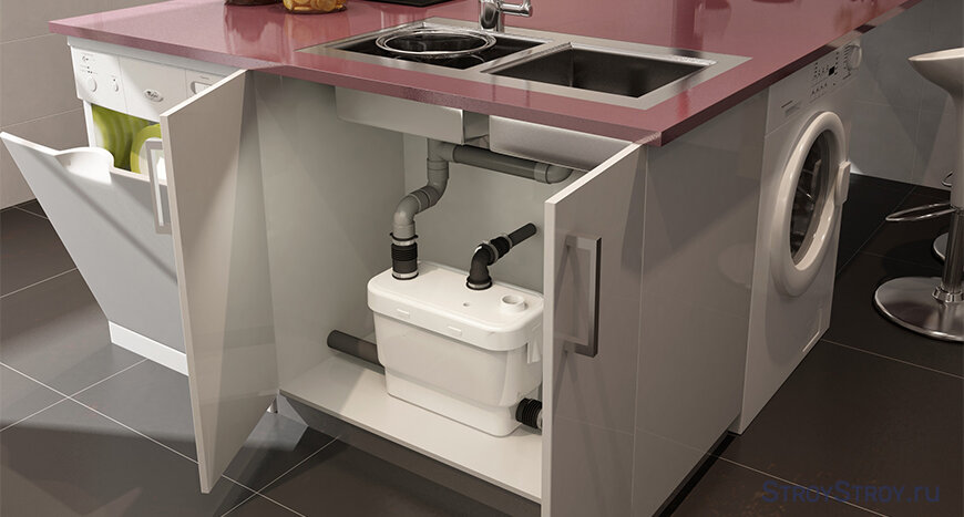 Эта, казалось бы, неподъемная проблема легко решается за счет специального насосного оборудования, обеспечивающим напорное отведение загрязненной воды. Компактную установку принудительного водоотведения (канализования) монтируют за унитазом, под раковиной или, скажем, в шкафу рядом со встроенной стиральной машиной. Такие агрегаты представляют собой симбиоз приемной камеры (резервуара) и канализационного насоса, который в принудительном режиме задает ускоренное перемещение стоков, причем по трубам стандартного диаметра (как правило, 22-32 мм и 40 мм для кухонной мойки).