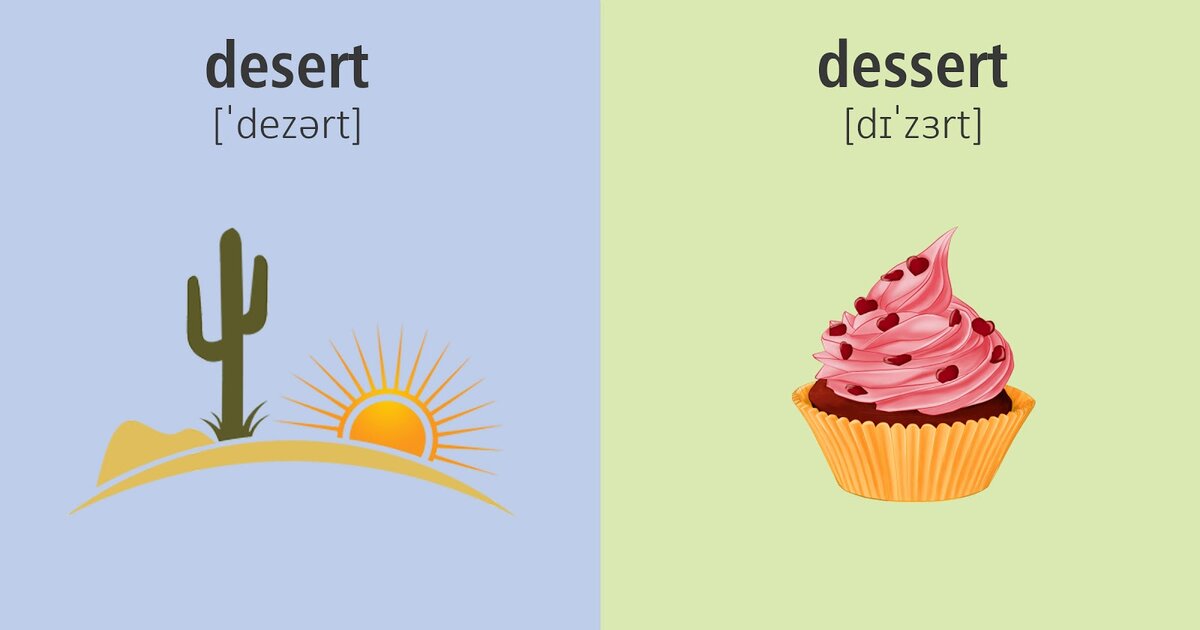 В английском языке, как и во многих других, существуют созвучные и похожие по написанию, но разные по значению, слова - омонимы. Главная проблема состоит в том, что их легко перепутать и в итоге не понять смысл сказанного. Как не допустить того, чтобы вместо десерта после ужина вы съели пустыню? Давайте разбираться вместе: 1. desert / dessert Слово desert означает: 1) пустыня; 2) покинуть, оставить; 3) необитаемый Слово dessert означает десерт. 2. diary / dairy Diary - дневник, ежедневник, записная книжка. Dairy - молочный, молочные продукты, сделанный из молока. 3. bear / bare Bear - 1) медведь. 2) нести, выносить, выдерживать, мириться. Bare- голый, обнаженный, непокрытый. 4. cereal / serial Сereal - каша, мюсли, хлопья. Serial - cерийный, последовательный, порядковый. 5. stationary / stationery Stationary - неподвижный. Stationery - канцелярские принадлежности. 6. storey / story Storey - этаж. Story - история, сюжет, рассказ. 7. principle / principal Principle - принцип,