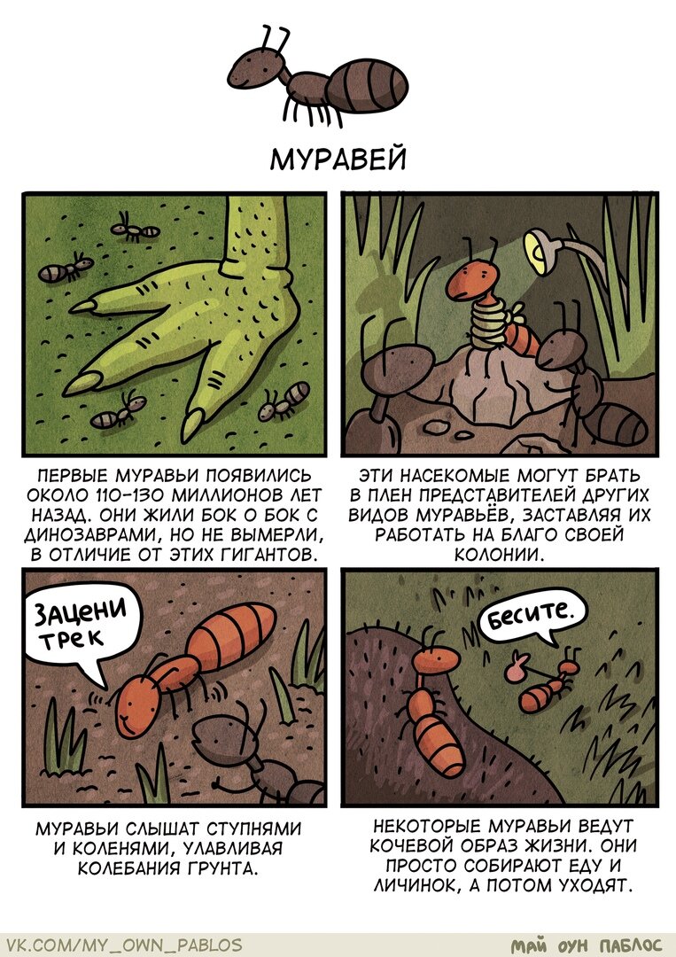 Весна пришла, а это значит настало время вспомнить о насекомых - ведь комары, мухи и прочая живность так и ждут, чтобы вновь ворваться в нашу повседневную жизнь. И я как раз нашел для вас смешные комиксы на эту тему. Вероятные факты - это серия юмористическо-познавательных комиксов о насекомых и других маленьких существах, которые рисует московская художница Анна Эргарт для своего развлекательного проекта Май оун паблос. В своей творческой группе Анна выкладывает комиксы, иллюстрации, музыку и даже клипы, но сегодня я хочу рассказать поподробнее именно о ее серии стрипов на тему насекомых. Небольшие комиксы под заголовком «Вероятные факты» сочетают в себе вполне серьезные факты из жизни насекомых с милыми и совсем несерьезными иллюстрациями. Даже если вам кажется, что вы и так уже знаете о жучках и паучках абсолютно все, уверен, в этой подборке вы обязательно найдете для себя что-нибудь интересное или смешное. К примеру, почему муравей может уйти из своей колонии? Или зачем божьей ко