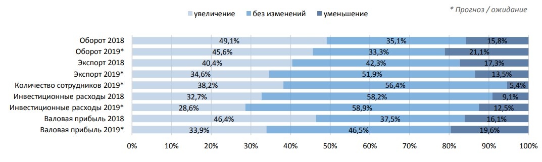 9 из 10 компаний ожидают улучшения или сохранения своего экономического положения в 2019 году. 7% прогнозируют ухудшение деятельности своей компании.