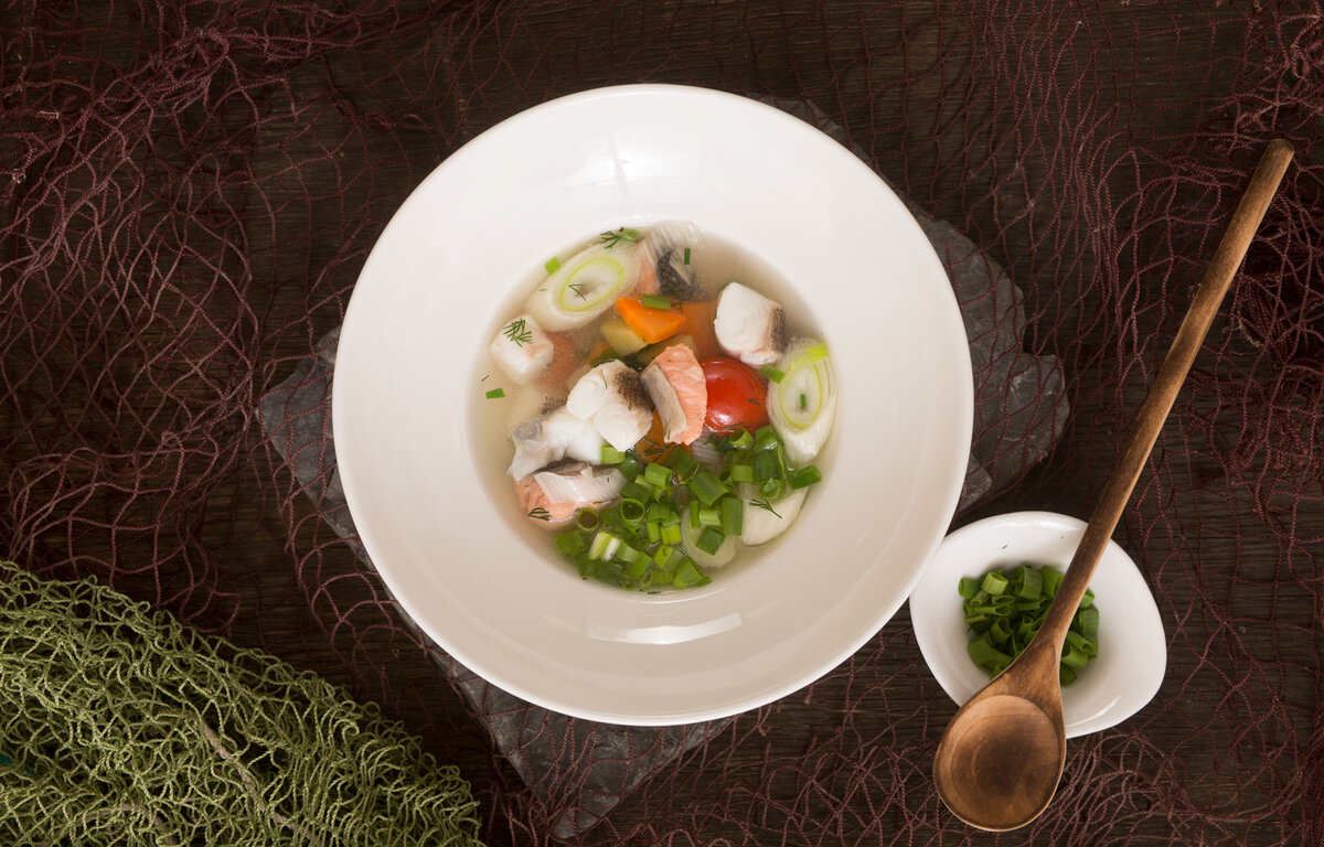 Уха из морской рыбы с ароматом костра. Дальневосточные шеф-повара очень любят сочетание лосося и палтуса за то, что они удачно дополняют друг друга по вкусу и структуре мяса, но рецепт будет работать и без палтуса. Энергетическая ценность (100 г): 89 кКал Ингредиенты (6 порций) 1. Лосось дальневосточный (сима, кижуч, кета, чавыча, нерка) филе на коже — 500 г