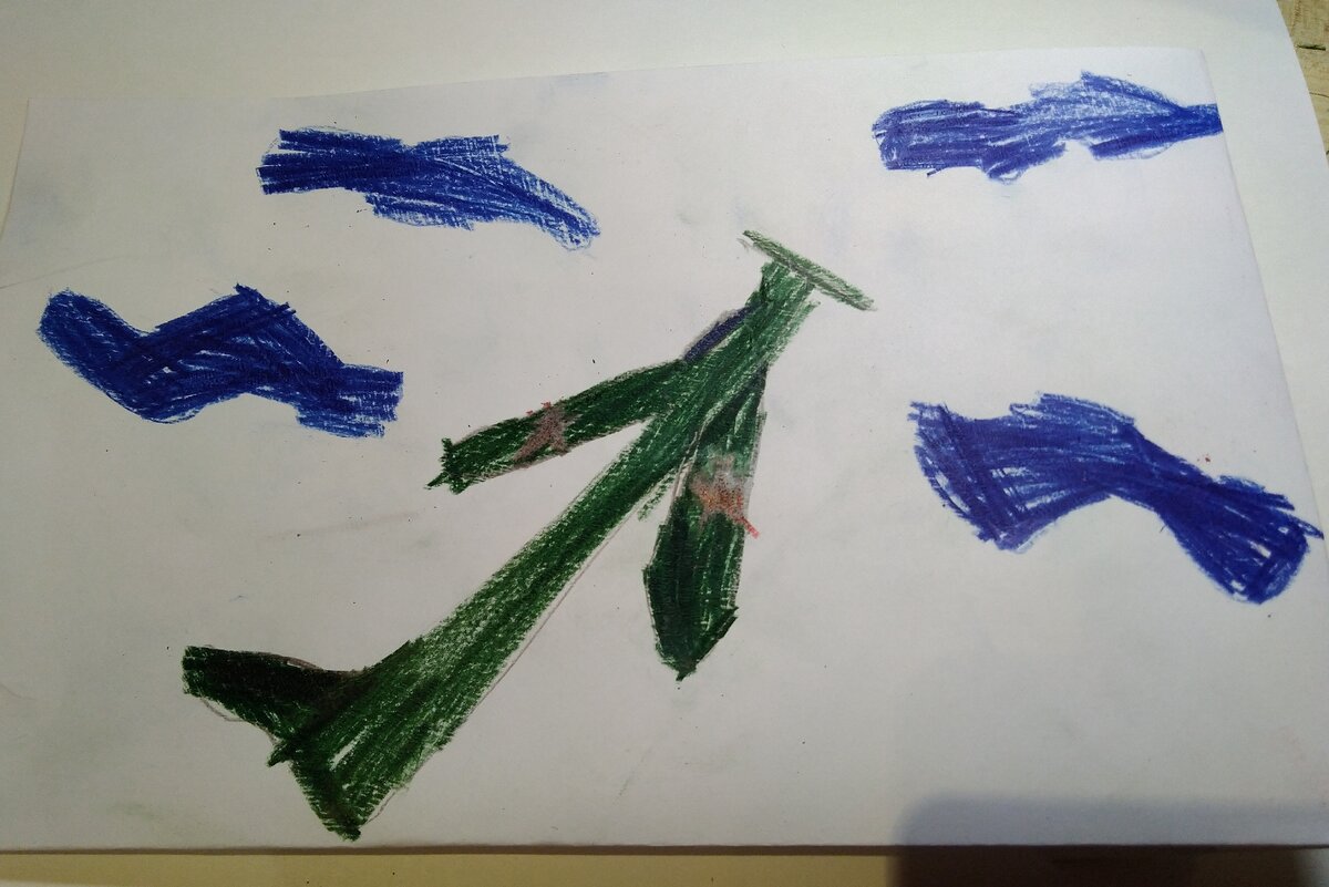 Поделки в садик бывают сложные и не очень. В последнее время мне встречается мнение, что домашнее творческое задание должен делать ребенок с минимальной помощью родителей. Дабы конкурс не превращался в соревнование родителей, где будут ярко выделяться шедевры тех, кто обучен рисовать в силу профессии или хобби. Итак открытка. Большую часть будет занимать рисунок ребенка. А, мы, взрослые, чуть добавим декора. Если Вам нравится такой подход, то смотрите, что получилось у нас. Такой, абсолютно самостоятельный рисунок. Оставляем, как есть, пусть облака синие, а звездочки хочется поправить. Сгибаем пополам лист бумаги А3, размещаем рисунок, приклеиваем. Далее понадобится георгиевская лента, продается в магазинах тканей по 4 р/метр, нам нужно немного. Из из того, что осталось от 1 м для следующей публикации сделаю значок. Ленту приклеиваем по краю рисунка. Середину на канцелярский клей, по краям на супер-клей. Осторожно, детям супер-клей НЕ давать! И для работы с бумагой он плохо п