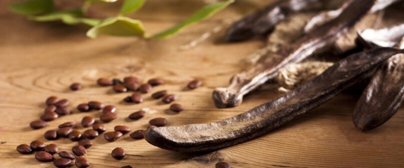 В нашей продукции вы можете встрерить сироп из рожкового дерева. В этой статье мы расскажем вам, что это за дерево и о полезный свойствах его плодов. У рожкового дерева много названий — цератония, сладкие рожки, цареградские стручки, хлебное дерево Иоанна, шоколадное дерево, харув, ювелирное дерево. О сладком вкусе плодов люди знают испокон веков и каждый народ, на чьих землях можно встретить эти деревья с развесистыми кронами, давал им собственное имя. Вечнозеленое растение, способное достигнуть высоту в 12 м, с широкой кроной, плотными перистыми листьями и плодами, собранными в стручок. Его различные части используются в кулинарии и народной медицине. А плоды рожкового дерева выглядят вот так: Плоды этого дерева богаты крахмалом, пищевыми волокнами, дубильными веществами, протеинами и органическими кислотами. В их состав входят витамины группы В, D, полезные жирные кислоты, танин, пектин, антиоксиданты и целый комплекс макро- и микроэлементов: железо, магний, хром, калий, кальций,