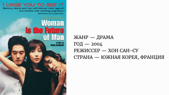 Фильм «Женщина - это будущее мужчины» | «Yeojaneun namjaui miraeda» Два старых приятеля встречаются после долгой разлуки - один из них ездил в США и учился на кинорежиссёра, второй преподавал в ВУЗе. Они и раньше не были особенно близкими друзьями, а теперь и вовсе чувствуют себя друг с другом неловко, но более близких друзей у обоих нет. Неловко переговариваясь, они неловко идут в кафе, и неловко пьют пиво, неловко вспоминая дела юности. Мы узнаём, что оба они встречались с одной и той же девушкой Сун Хва, которая сейчас работает в баре в городе Пусане, но тот парень, который стал режиссёром, уезжая в США унёс в сердце любовь к Сун Хва, а второй, учитель, просто трахает всё, что попадается на пути, и после отъезда друга ему попалась Сун Хва. Выпив ещё, парни решают поехать и навестить Сун Хва, хотя оба чувствуют, что ничем хорошим это не кончится - неловкость и потерянность, отсутствие доверия, скованность и стыд, всё это и так наполняет их встречу друг с другом, а скоро усилится ещё