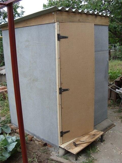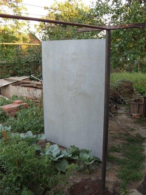 Итак, для начала были куплены уголки и плоский шифер. Размер будущего душа подгонялся именно под размер шифера - получается великовато, ну, да и фиг с ним. К листу шифера прикрутил уголки, поставил строго вертикально, забетонировал
