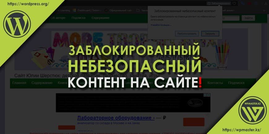 Заблокированный небезопасный контент на сайте. Приветствую, дорогие друзья! Если вы начинающий веб-мастер или просто автор блога эта статья будет безусловно полезна для вас. Речь пойдет о сообщении в правом углу адресной строки "Заблокированный небезопасный контент". Иногда это сообщение может абсолютно не вредить сайту, а иногда это может испортить внешний вид кардинально и не только. Если вы читаете эту статью, значит у вас на сайте появилась такая проблема. И вы решили её устранить и понять почему она произошла. Об этом и поговорим в этой статье. Я расскажу из-за чего она появляется, как её обнаружить и как устранить. Но давайте всё по порядку ... Причина появления этого сообщения. Сообщение "Заблокированный небезопасный контент" возникает обычно на тех сайтах, где установлен SSL сертификат безопасности. Иными словами, где адрес сайта выглядит так: https://wpmaster.kz/. И появляется данная проблема тогда, когда на защищенном сайте появляются подключения по обычному протоколу http: