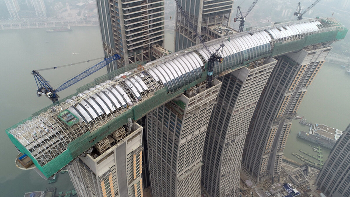 Raffles City Chongqing строится в одноименном городе Чунцин в центральной части Китая. На данном небоскребе насчитывается примерно 1,12 млн кв.м. площади. Его особенность в том, что состоит он из восьми башен, которые связаны друг с другом на вершине, насчитывающим 250 метровым коридором. Этот «поднебесный» мост в конечном итоге будет весить порядка 40 тысяч тонн (в том числе из 12 тысяч которых - стекло). Конструкция его слегка изогнутая - благодаря этому, людям, находящимся на вершине здания, открывается захватывающий вид на город, практически, с высоты птичьего полёта. Восемь башен будут иметь различное назначение. В них расположатся квартиры, офисы, торговые площади, а так же несколько гостиниц. Сам коридор же будет выполнять, так скажем "релаксационные" функции: там будут пейзажный б