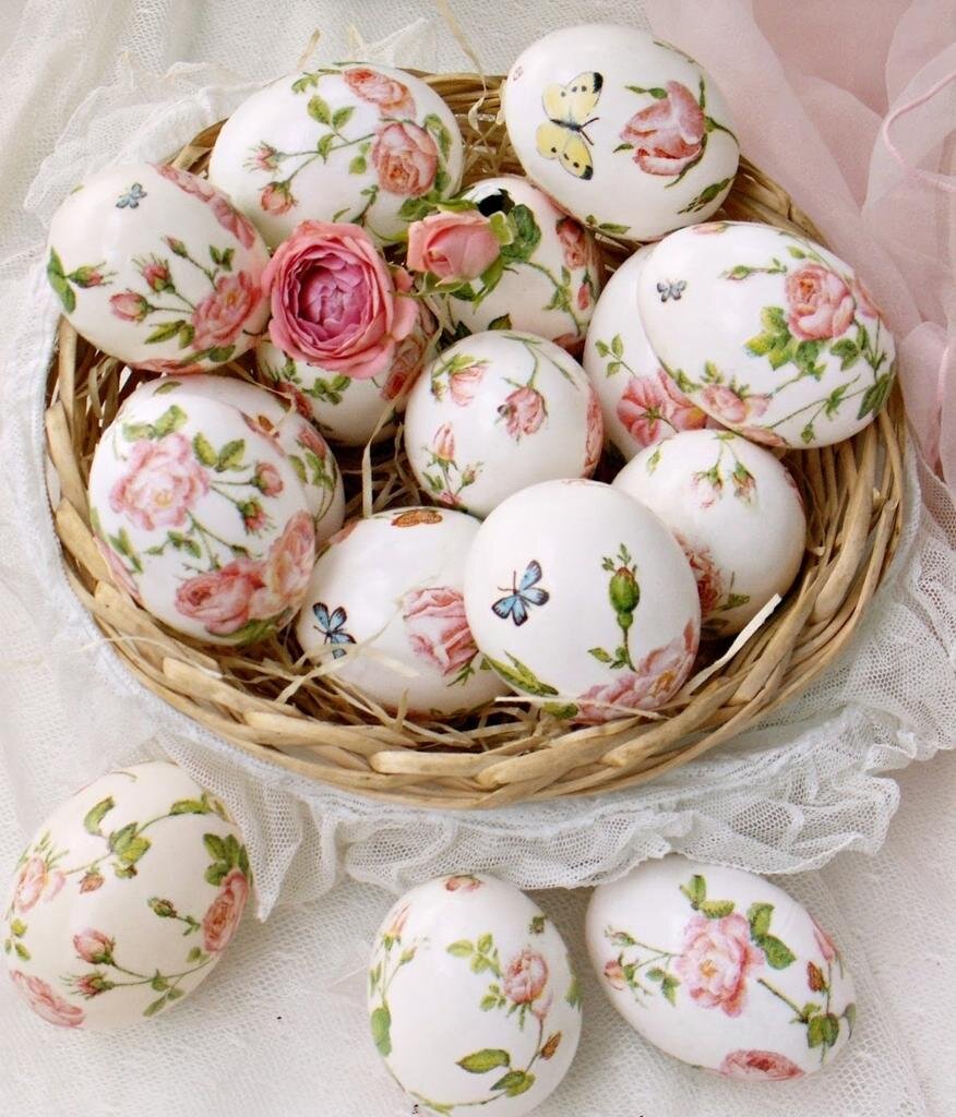 Еще один вариант украсить яйца на Пасху. Таким способом украшать куриные яйца очень просто и интересно. Сейчас в магазинах можно найти множество салфеток с разными интересными рисунками. Что понадобится: 1. Белые куриные яйца. 2. Салфетки. 3. Куриный белок. 4. Кисточка. Способ декорирования: 1. Первым делом разбираем салфетку на слои. Нам понадобится самый верхний слой с рисунком. Ножницами вырежьте понравившуюся часть рисунка. 2. Вместо клея необходимо использовать сырой яичный белок. Он отлично для этого подходит. 3. Возьмите яйцо, приложите картинку в том месте, которое вам больше нравится. Кисточкой аккуратно нанесите белок поверх салфетки. Высыхает быстро и перестает липнуть!