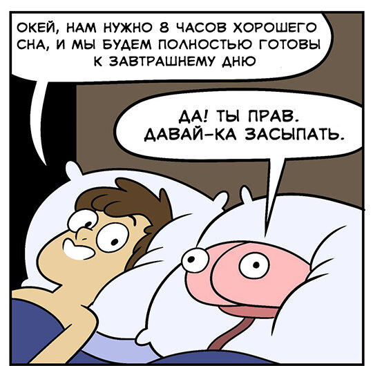 Забавный комикс о том, как тяжело бывает договориться с собственным мозгом, когда пытаешься заснуть пораньше