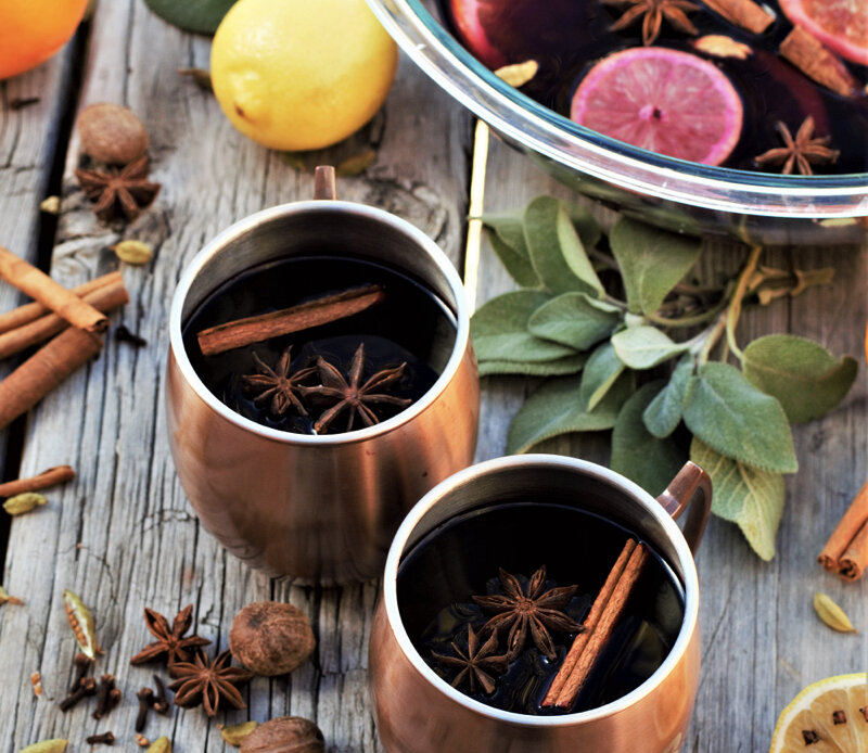В холодный вечер нет ничего лучше, чем свернуться калачиком перед камином с бокалом обжигающего глинтвейна! В моем рецепте глинтвейна я использую один средний апельсин с кожурой и соком, который добавит легкий цитрусовый и терпкий вкус, а также я добавляю специи корицу, гвоздику и звездчатый анис. В эту смесь я добавляю бутылку сухого красного вина, и оставляю ее медленно греться на пару и впитывать в себя вкус сиропа. Таким образом, алкоголь не испаряется слишком сильно, и вино наполняется чудесными ароматами цитрусов и специй. Я знаю рецепты глинтвейна, в которых используется яблочный сидр, но на мой взгляд он слишком сильно меняет вкус напитка. Но, если вы хотите - можете и его тоже добавить. А вот и мой лайфхак - чтобы было бы легче вынуть гвоздику из готового напитка. я втыкаю ее звездочки в апельсиновую кожуру. А еще можно использовать специальную салфетку (саше) для специй, в которую заверните гвоздику и звездчатый анис, а затеи легко их . будет выловить их перед подачей н