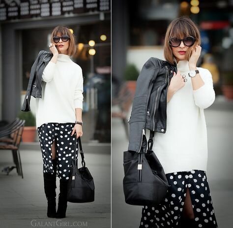 С чем сегодня сочетают юбки в горошек, чтобы выглядеть стильно и современно – в нашем материале. Юбка в горох очень интересный и самодостаточный элемент гардероба. Если вы решили составить образ и сочетание с юбкой в мелкий горошек или крупный горох, то учитывайте несколько основных правил: Юбка в горошек: с чем носить? Длинная юбка в крупный горох настоящее открытие модного сезона 2019. Длинная юбка всегда притягивает внимание. Верх должен подходить к ней по цвету. Это может быть простая майка с широкими лямками, однотонная водолазка, боди, блузка. В качестве верхней одежды выбирают кардиганы или объемные, бесформенные свитера, которые подчеркивают утонченность и изящность фигуры. Обувь должна быть на маленьком каблуке или плоской подошве. Юбка-карандаш в мелкий горошек длиной до колена станет прекрасным элементом офисного стиля. Нужно дополнить ее однотонным топом или блузой, без принта, надеть короткий пиджак или блейзер. К такому наряду подойдут лодочки на высоком каблуке. Коротка