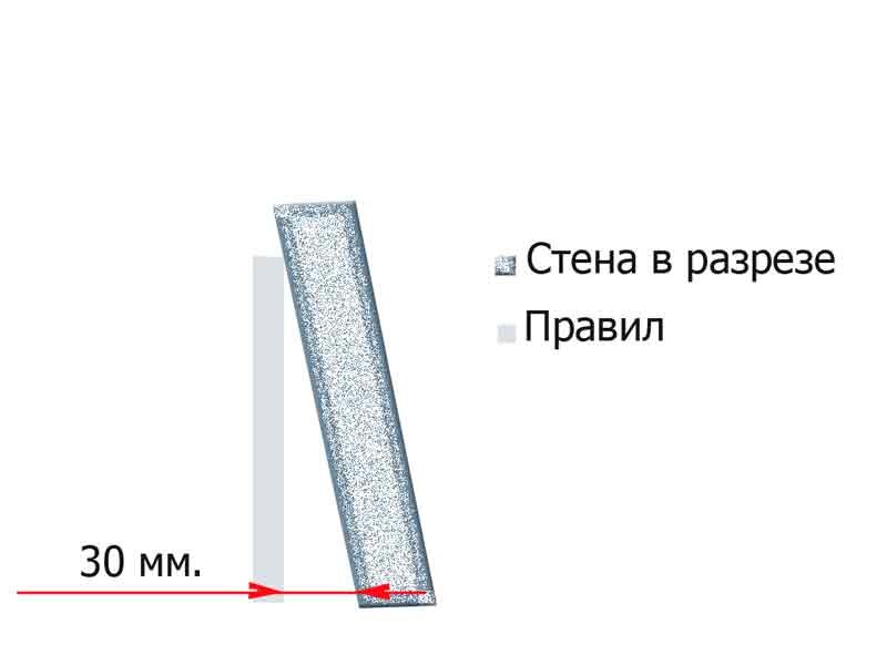 Отнимите от минимального размера три миллиметра, что-бы был запас хода и маяк не уперся в стену. В моём случае получилось 27 миллиметров. Теперь отнимем толщину маяка. Толщина моих маяков шесть миллиметров. Получаем 21 миллиметр. Отмерим на правиле 21 мм и проведём линию.