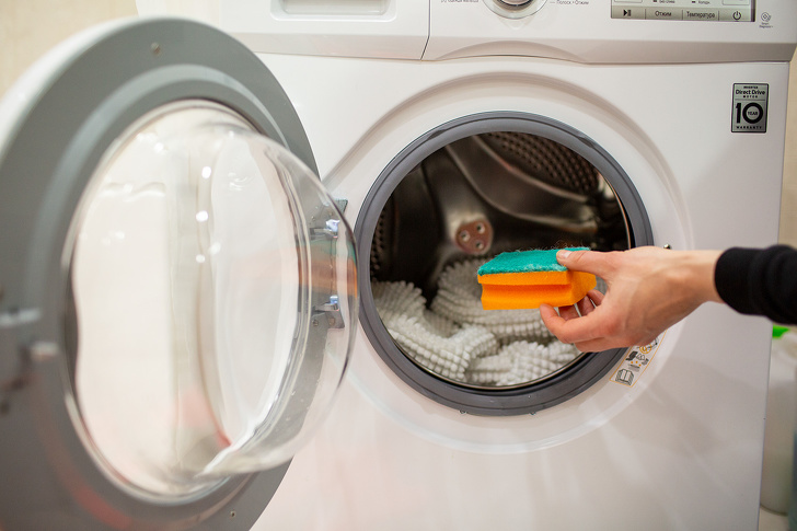 В раствор помещают губку для мытья посуды, а после, ее кладут в барабан к постельному белью. Данная процедура помогает сделать постиранные изделия, мягкими, и приятными на ощупь.