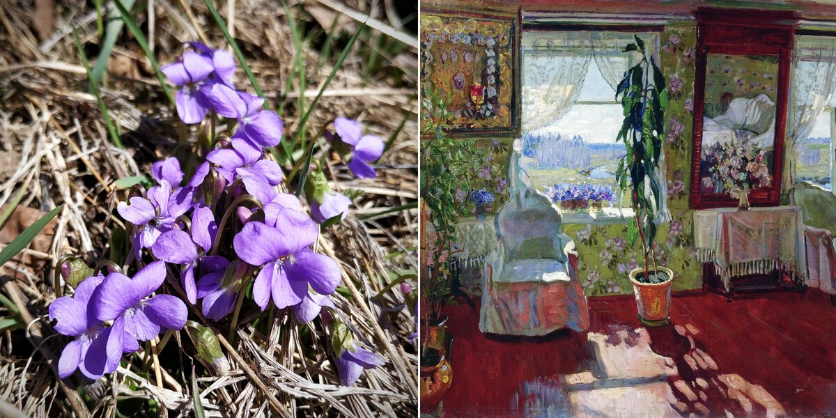 Какая связь между этими изображениями? Левое я сделала вчера в Южном Подмосковье. Правое написал русский живописец Станислав Жуковский. Наверняка вы уже догадались. Это фиалки. У меня они стелются по тёплой апрельской земле, укрытой прошлогодней хвоей (недалеко растут сосны). У Жуковского – стоят на подоконнике русского дома, в окна которого видны солнечные дали с новой травкой и пока ещё голыми берёзами. Кстати, именно по ним и можно догадаться о родовой принадлежности растения, изображённого на картине: по срокам это конец апреля, листьев на берёзах ещё нет, но снег уже полностью сошёл. Это и есть время зацветания лесной фиалки. А вот на картине ниже –другой цветок, потому что снег ещё не растаял – следовательно, и фиалкам быть рановато: Я обнаружила ящики с фиалками во многих интерьерах Станислава Жуковского. Вот знаменитые "Весенние лучи" от 1913 года. Прозрачное небо в окнах, звонкое солнце на полу, кресла красного дерева в стиле ампир и драгоценное украшение – живые фиалки на под