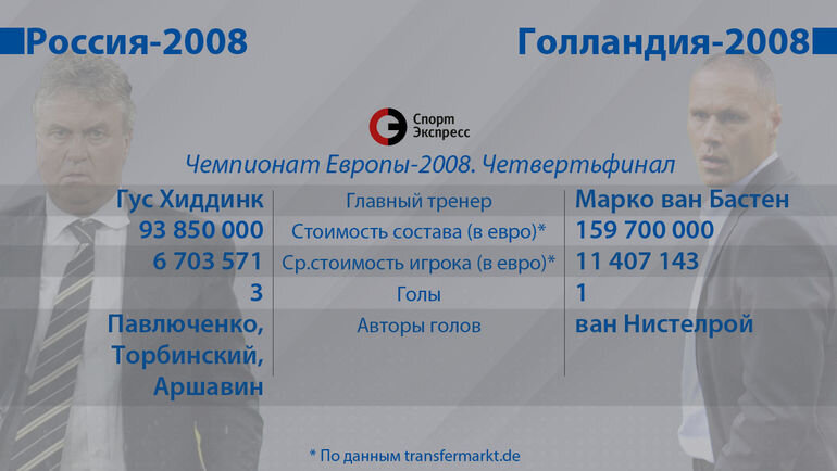 Россия В четвертьфинале Евро-2008 соперниками команды Гуса Хиддинка стали голландцы, стоимость состава которых более чем в полтора раза превышала российскую. Кроме того, на двух предыдущих чемпионатах Европы (2000, 2004) они брали бронзовые медали. Мало кто поставил бы на победу России. Но именно это и произошло. Гол Павлюченко во втором тайме, ответ ван Нистелроя за несколько минут до конца основного времени и два сумасшедших мяча во второй дополнительной 15-минутке от Торбинского и Аршавина, которые вывели Россию в полуфинал, а 700 тысяч человек (по данным ГУВД Москвы) – на улицы столицы, где они отмечали исторический успех до самого утра. Голландия Оранжевые на Евро-2008 легко выскользнули из группы смерти, в которой одержали три убедительные победы – над Францией, Италией и Румынией, – потому считались безоговорочными фаворитами 1/4 финала. Вполне возможно, дурную шутку с ними сыграло то, что в заключительном матче группового этапа против румынской команды они дали отдохнуть своим