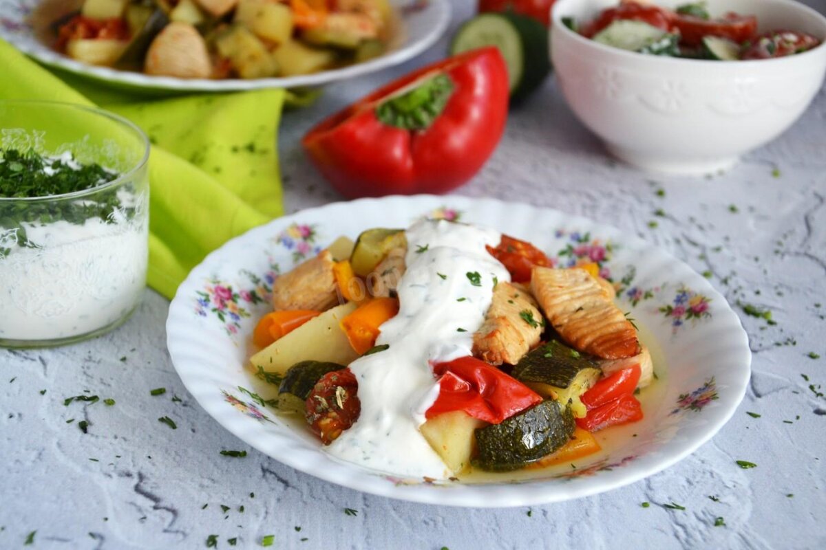 Как лучше приготовить индюшку? Знакомьтесь с интересным и простым рецептом. Индейка с овощами в духовке получается настолько вкусной, что про курицу забудете надолго. Приблизительное время приготовления 2 часа Калорийность 108 ккал/100 г Ингредиенты (5 порций) · филе индюшки – 500 г; · цуккини – 1 шт; · соль – по вкусу; · растительное масло – 4 ст. л; · картофель – 400 г; · чеснок – 2 зубчика; · прованские травы – 5 г; · болгарский перец – 2 шт; · свежемолотый перец – по вкусу; · помидоры черри – 150 г Для соуса понадобится · укроп – 50 г; · сметана – 150 г Подготовка овощей и индейки Моем и очищаем картофель. Нарезаем его небольшими кубиками. Помытый перец разрезаем, вычищаем семена. Нарезаем на квадратики. Также нарезаем и цуккини. Цуккини можно заменить кабачком. Все нарезанные овощи выкладываем в форму для запекания. Солим, посыпаем перчиком. Поливаем сверху подсолнечным маслом (2 ст. л). Перемешиваем. Вырезаем подходящего размера лист фольги. Накрываем форму. Выпекаем 30 минут в