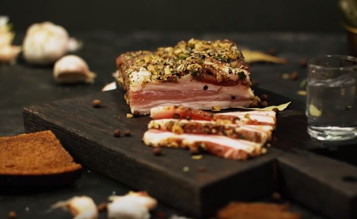 О полезных свойствах сала известно давно. У многих проживающих на севере народов этот продукт является традиционным по ряду причин: • Для выживания в суровых климатических условиях требуется потребление калорийной пищи, а сало таковым и является; • Помимо вкусовых качеств, сало содержит в себе множество необходимых и полезных для человеческого организма минералов и питательных элементов, витаминов и даже полезный холестерин и жирные кислоты; • Также оно долго не портится и прекрасно хранится; • Является доступным для северных народов продуктом, потому что их основной род деятельности – скотоводство. Существует множество различных способов и вариантов засолки сала, которые можно поделить на сухие и мокрые способы. Вот наиболее распространённые из них. 1) Вариант сухого способа засолки сала. Взять сало со шкуркой и желательно с прожилками мяса. Порезать на порционные кусочки. Взять эмалированную кастрюлю, на дно насыпать слой соли. Сало хорошенько обвалять в соли, нашпиговать чесноком