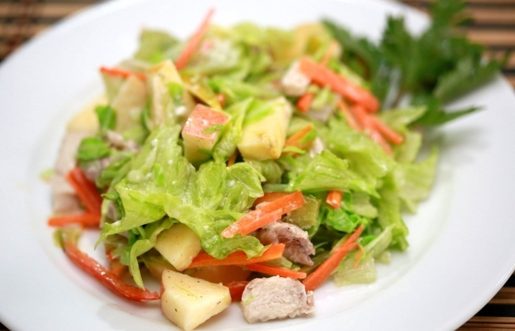 Понадобится : Ветчина 100 г Сладкий перец 1 шт. Свежий огурец 1 шт. Помидор 1 шт. Чеснок 2 зубчика Сыр 50 г Майонез 100 г Лук зеленый Маслины для украшения Приготовление : 1. Продукты нашинковать соломкой, смешать, уложить в салатник. 2. Полить майонезом, посыпать зеленым луком. 3. Украсить помидорами и маслинами. Если вам понравилась статья, поставьте "Лайк" и подпишитесь на наш канал.