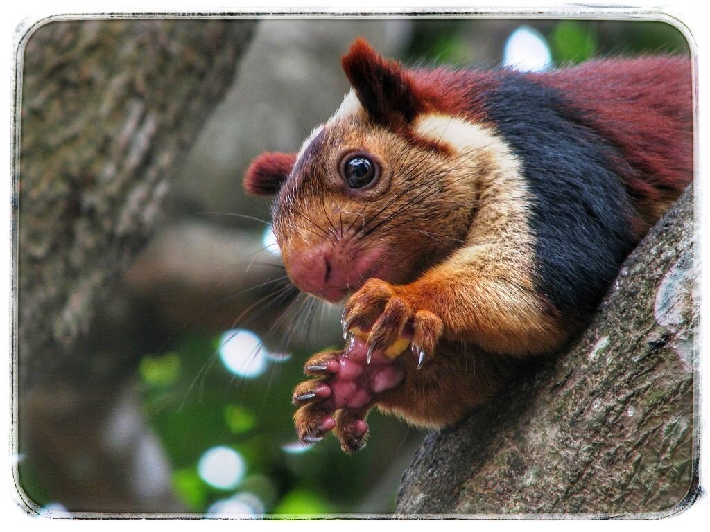 Это животное и в самом деле большинство людей принимает за лемура или какого-то другого зверя, например, за обезьянку. Зовут это животное ратуфа (лат. Ratufa indica) и обитает оно в Индии. Другим его названием является «индийская гигантская белка», хотя в самой Индии бытует другое название. Местом жительства для них служат леса Индостана и окрестностей, вплоть до Вьетнама. Правда, как всегда, леса стремительно вырубают, и белок, которые в них живут, становится все меньше. И это при том, что зоологи даже толком не определились, сколько существует подвидов этого замечательного зверька, и считать ли их подвидами, или это вообще отдельные виды. Активность они проявляют по большей части утром и вечером, а днем у них сиеста. Размер у этих товарищей больше, чем у кошки, и длина одного только тела доходит до полуметра, плюс еще до 60 см хвоста, которым они поддерживают баланс своего тела, что крайне важно для обитателей деревьев. Неудивительно, что этого переростка просто в голову не приходи