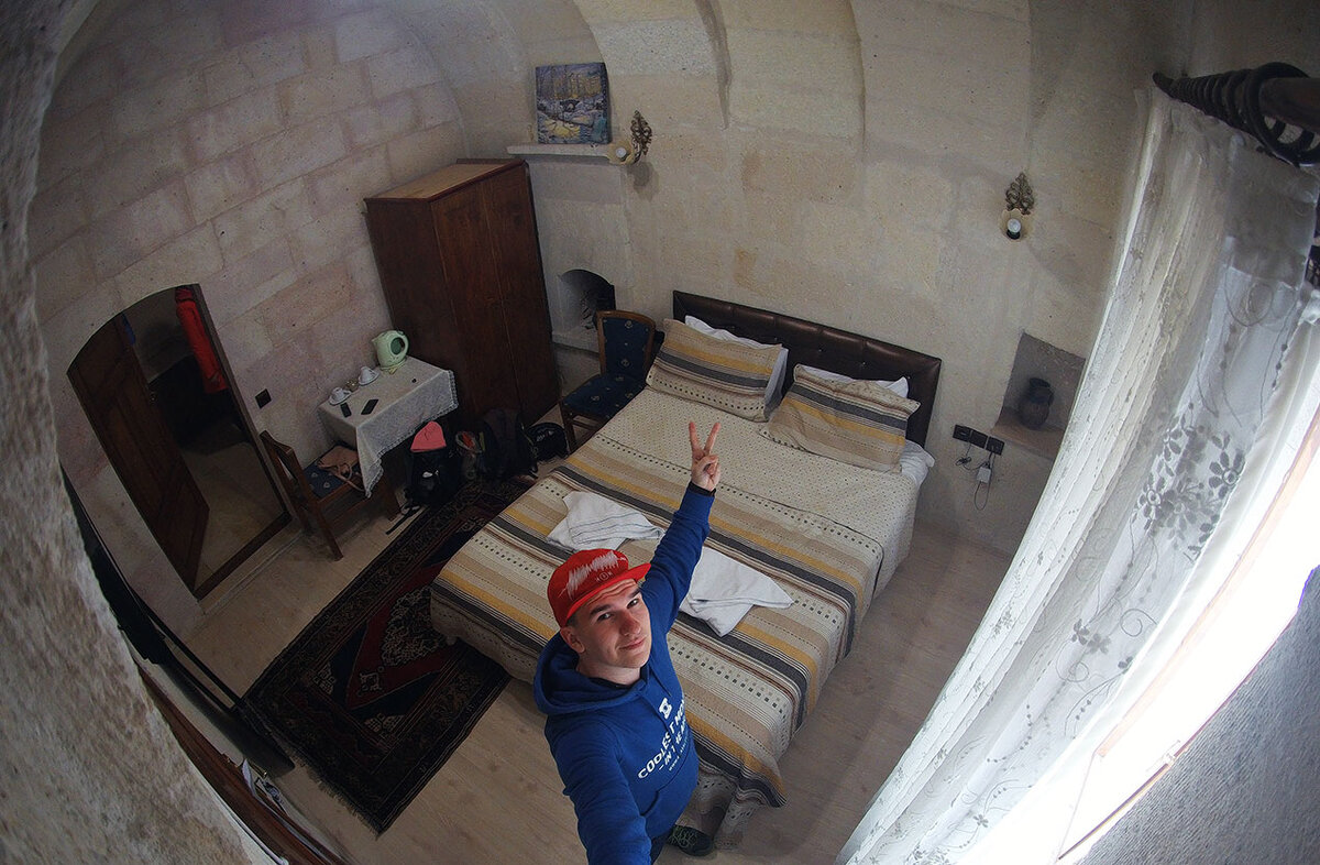 Каппадокия это такое чудесное место в Турции, где нельзя просто взять, и остановиться в обычном отеле. Здесь можно провести ночь в скалах или отелях сделанных в пещерах. Со всеми удобствами! Мы выбрали вариант проживания в номере «пещера» бюджетного отеля View Cave Hotel в Гёреме. В чем отличия элитности пещер? Те, что стоят недорого (номер в View Cave обошелся в 1400 рублей за ночь) созданы искусственно. Вот например наш номер: Он сделан полностью из песчаных блоков рядом с настоящей скалой. Дорогие отели (более 120$ за ночь) сделаны в настоящих пещерах на многочисленных склонах города Гёреме.