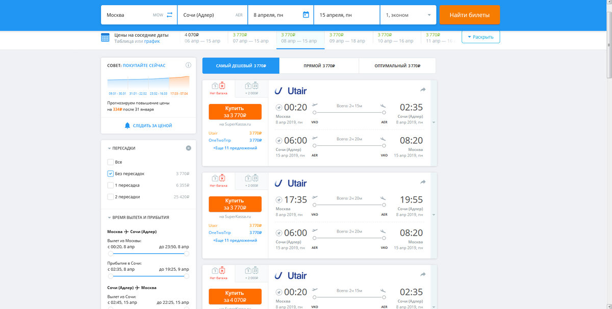 Билеты в Сочи на самолете из Москвы стоят всегда дешевле из-за большого турпотока, но сейчас многие авиакомпании запускают недорогие тарифы почти из всех городов России. Только такие недорогие билеты разбирают очень быстро. Поэтому я рекомендую покупать билеты заранее.