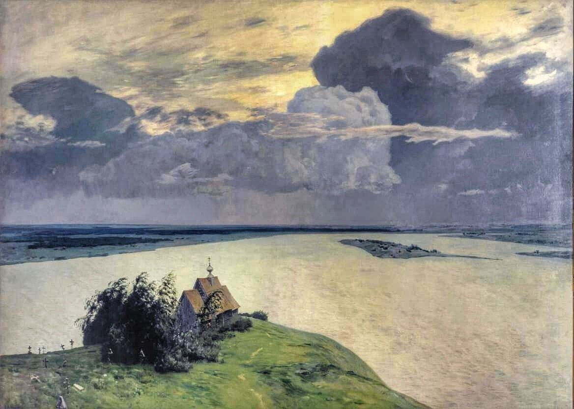 Исаак Левитан. Над вечным покоем. 152 х 207.5 см. 1894 г. Государственная Третьяковская галерея, Москва. Исаак Левитан (1860-1900 гг.) считал, что в картине «Над вечным покоем» отражается его сущность, его психика. Озеро Удомля в Тверской области. Эта работа как будто отражает эмоции художника. Ранимый, склонный к депрессии, тонко чувствующий. Это читается в мрачных оттенках зеленого и свинцового. А вот сама картина уже создавалась в студии. Левитан оставил место эмоциям, но добавил размышления. Смысл картины «Над вечным покоем» известен со слов художника. Художник пишет картину как с высоты птичьего полёта. Мы смотрим сверху на кладбище. Оно и олицетворяет вечный покой уже ушедших из жизни людей. Этому вечному покою противопоставлена природа. Она в свою очередь олицетворяет вечность. Причём вечность устрашающую, которая поглотит всех без сожаления. Природа величественна и вечна по сравнению с человеком, слабым и недолговечным. Бескрайний простор и облака-великаны противопоставл