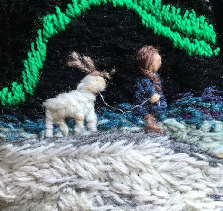 Женщина сидела на вершине холма, в ее руках мелькала игла, а шерстяная гладь варежек покрывалась узором.