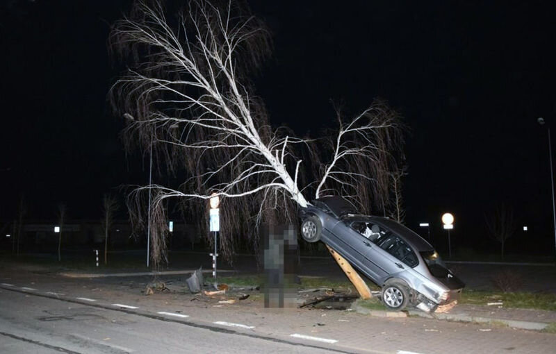 В полицию поступила информация, что на одной из улиц машина висит на дереве. И это оказалось правдой. Необычное событие произошло в польском городке Януве Любельском. Сотрудники местной полиции получили информацию, что на одной из улиц машина висит на дереве. Прибыв на место, стражи порядка обнаружили, что BMW действительно находится на стволе дерева под углом приблизительно 45 градусов. Со стороны это выглядело так, будто автомобиль пытался залезть на березу. Выяснилось, что управлял машиной 21-летний молодой человек, как потом оказалось, в его крови было порядка 1,5 промилле алкоголя. Пьяный водитель потерял контроль над машиной, и она врезалась в дерево. Интересно в этой ситуации то, что на трезвую голову сотворить такой трюк было бы сложно, а вот спьяну — пожалуйста. Кроме водителя в машине находилось еще трое молодых людей, 17, 18 и 20 лет. Все получили ранения и прямиком отправились в больницу. Но всем троим, можно сказать, повезло, ранения оказались несмертельными, часто столкн