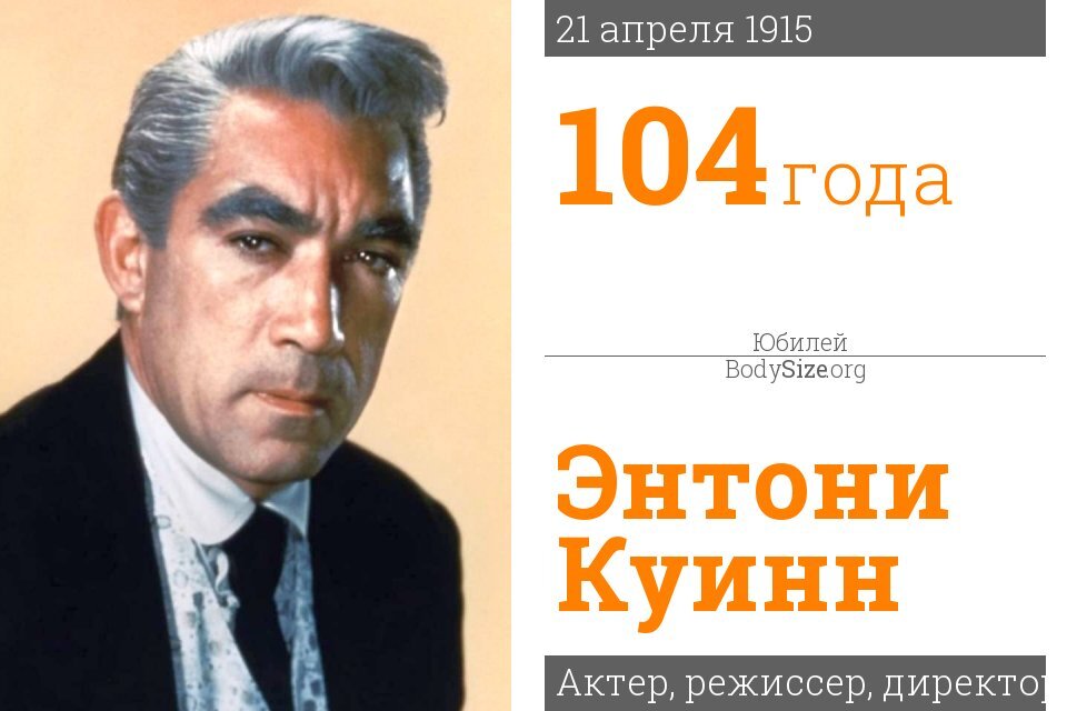 10. Энтони Куинн Энтони Куинн — американский актёр, писатель и художник мексиканского происхождения. Дважды лауреат премии «Оскар» за роли второго плана (1953 — «Вива Сапата!»; 1957 — Гоген в фильме Винсента Миннелли «Жажда жизни»). Среди других крупных киноработ — вождь бедуинов в оскароносной картине Дэвида Лина «Лоуренс Аравийский» (1962) и грек Зорба в одноимённом фильме Михалиса Какоянниса 1964 года. Также снялся в двух знаменитых фильмах Мустафы Аккада «Мухаммад — посланник Бога» (в роли Хамзы, дяди пророка Мухаммада) и «Лев Пустыни» (в роли Омара аль-Мухтара). 9. Тоби Стивенс Известный актер Тоби Стивенс родился 50 лет назад 21 апреля 1969 года. 8. Томас Доэрти Известный актер Томас Доэрти родился 24 года назад 21 апреля 1995 года. 7. Полина Рожински Известная актриса, модель, телеведущий, диджей Полина Рожински родилась 34 года назад 21 апреля 1985 года. 6. Робби Амелл Роберт П́атрик «Робби» Амелл — канадский актёр. 5. Энди МакДауэлл Розали Андерсон (Энди) Макдауэлл — американ
