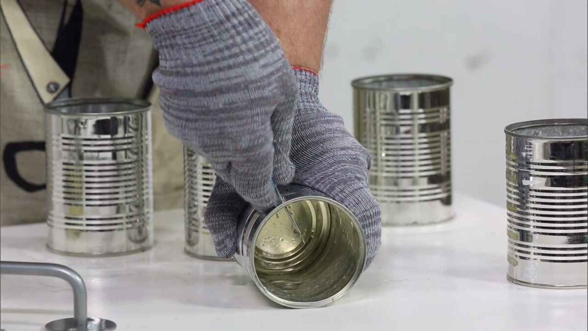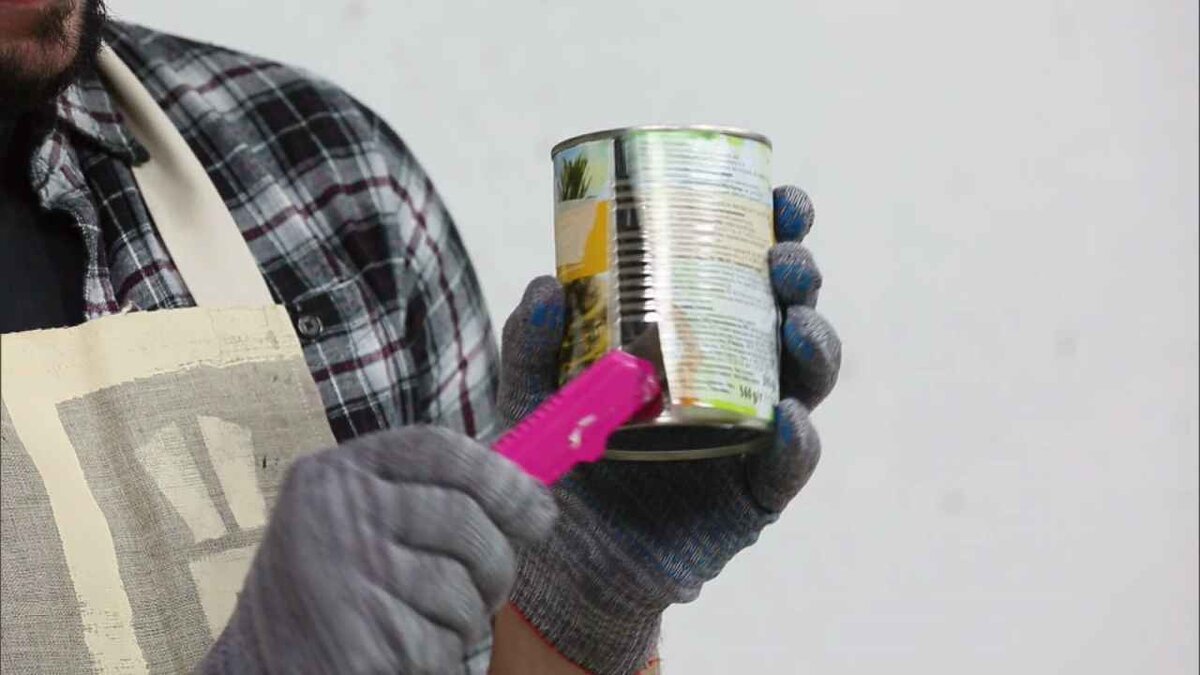 Из ненужных жестяных банок получаются отличные и красивые контейнеры для хранения всяких мелочей - карандашей, ручек, кисточек, ниток - да всего, чего угодно. Причём такие контейнеры можно как поставить на поверхность, так и подвесить к стене. С помощью канцелярского ножа снять этикетку с жестяной банки. Чтобы оставшийся на банке клеевой состав отошёл легко, можно предварительно подержать Банку в теплой воде. С помощью шила проделать в банках отверстия. Малярным скотчем обернуть нижнюю часть одной банки. Покрасить банку. Низ каждой следующей банки покрыть другим цветом. После того, как слой краски просохнет, защитить его бумажным скотчем. Покрасить верхнюю часть банки в белый цвет. Когда белая краска просохнет, снять скотч. С помощью шуруповёрта прикрутить рейлинг к поверхности. С помощью крючков повесить банки на рейлинг. В таких банках удобно хранить любые мелочи.