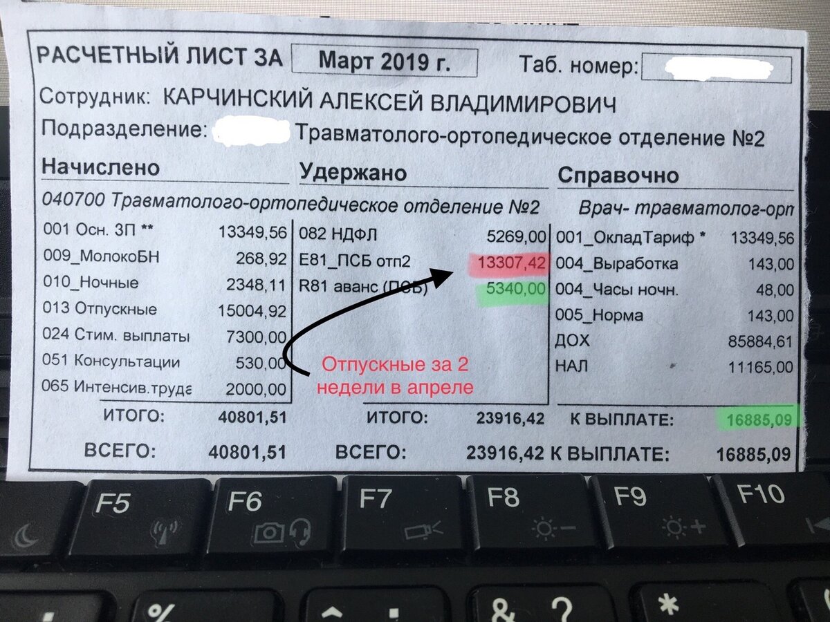 И вот перед нами новый расчетный лист Алексей Карчинского - со всеми доначислениями там стоит сумма в 40 тыс. рублей. Комментарий самого медика: «Заработная плата подросла до 22,2 тыс. рублей. Также в расчете указаны отпускные за 2 недели в апреле - 13,3 тыс. рублей. Норма часов за месяц выработана на ставк
