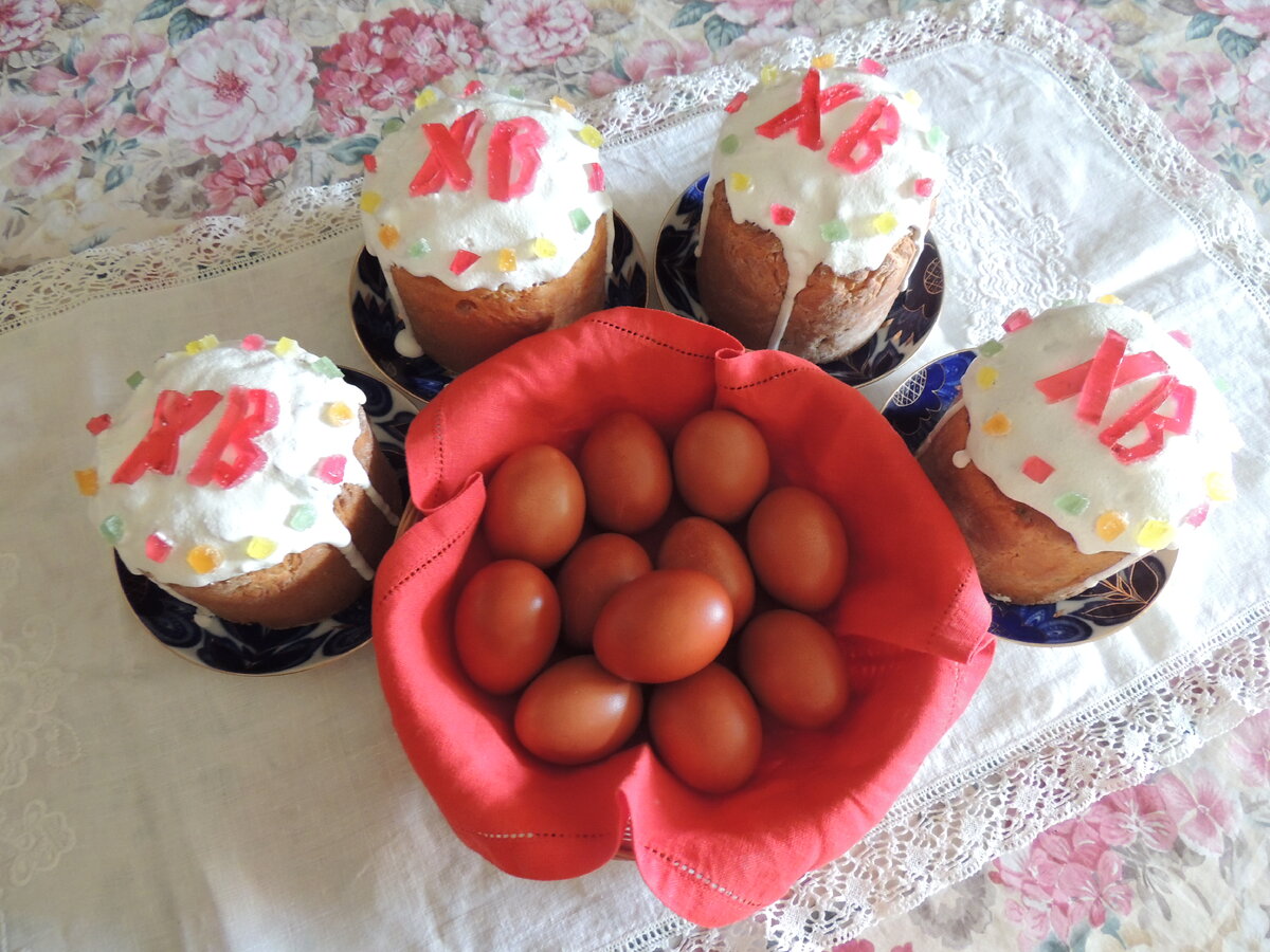 Для украшения я беру цветной мармелад – зеленый, малиновый, красный, желтый. Или покупаю на рынке цветные цукаты (это совсем не те цукаты, которые мы готовим из апельсиновых корочек!) – оранжевые, зеленые, красные, жёлтые. Буквы ХВ (Христос Воскресе) вырезаю ножом из красного, или малинового мармелада (или цукатов), потом кладу их в центре на глазурь, а по кругу выкладываю цветными квадратиками из мармелада (или цукатов). Сейчас, говорят, в магазинах продаётся готовая пищевая мастика. Из неё можно вырезать буквы ХВ, и другие украшения.