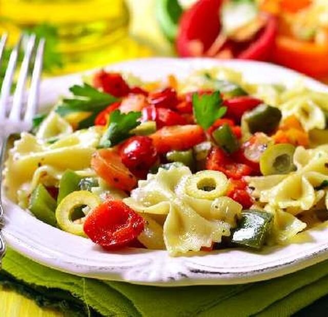Для заправки в чаше блендера смешать: зелень петрушки, несколько листиков зелёного базилика, соль, чёрный молотый перец, маленький зубчик чеснока и немного сушеного орегано и оливковое масло. Собираем салат. Выкладываем в салатник рукколу, отваренные макароны, зелёную фасоль, консервированную кукурузу . Помидоры черри и оливки без косточки режем пополам и также отправляем в салатник. Перемешиваем и добавляем заправку. Ещё раз перемешиваем и даём настояться десять минут.