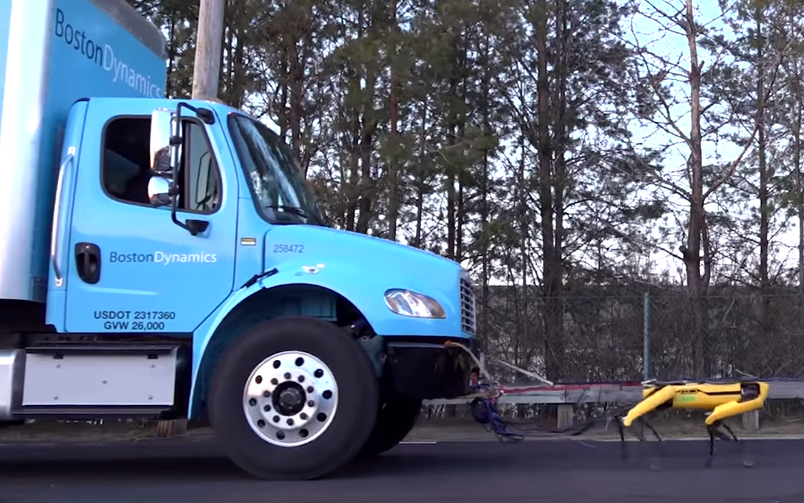 Boston Dynamics изготовила для роботов SpotMini упряжку и заставили их тянуть по дороге грузовик. Десять роботов — по два в каждом ряду — без проблем смогли протащить автомобиль через всю парковку компании.
