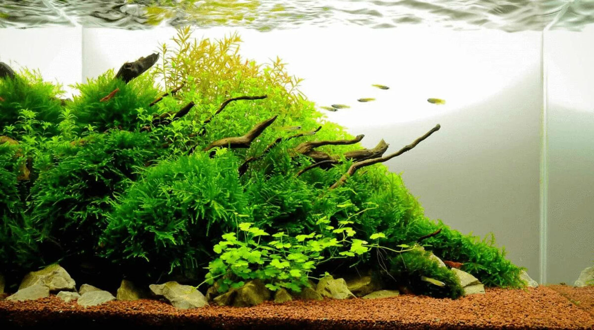 Конечно, окружающий мир сам по себе способен удивлять своей натуральной красотой. Но если создавать природный аквариум своими руками, то его владельцу нужно включить фантазию и заодно соблюсти несколько простых законов соблюдения композиции, чтобы конечный акваскейп смотрелся гармонично и радовал глаз. Всего существует три вида композиции: Треугольник. Особенностью этого типа является то, что все элементы декора располагаются в одном углу и постепенно «спускаются» к другой части. Например, слева сажается крупное растение вроде нимфеи, эхинодоруса оцелот, апоногетона живородящего. Тут же размещаются валуны или коряги, правее уже находятся средние кусты (папоротники, криптокорина Вендта, анубиас), камни и продолжение веток, а в оставшейся зоне практически ничего нет, кроме почвопокровных или низких разновидностей флоры вроде марсилии, крапчатого эхинодоруса, кубы и т.д.; Остров или выпуклая композиция. В ней в центре находится основная часть декора, линейно смещенная к краю, согласно пр