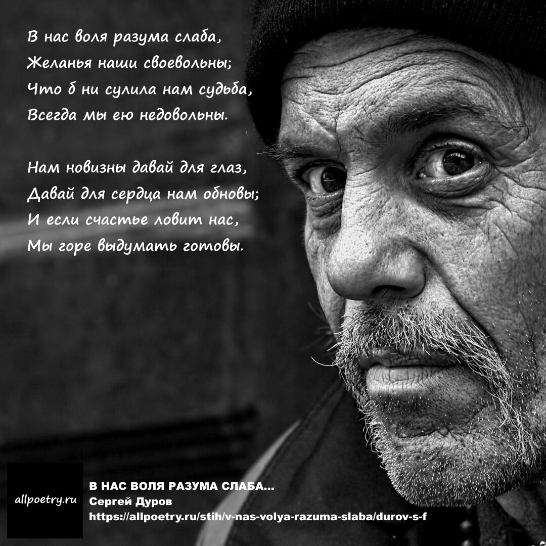 В нас воля разума слаба,Желанья наши своевольны;Что б ни сулила нам судьба,Всегда мы ею недовольны.