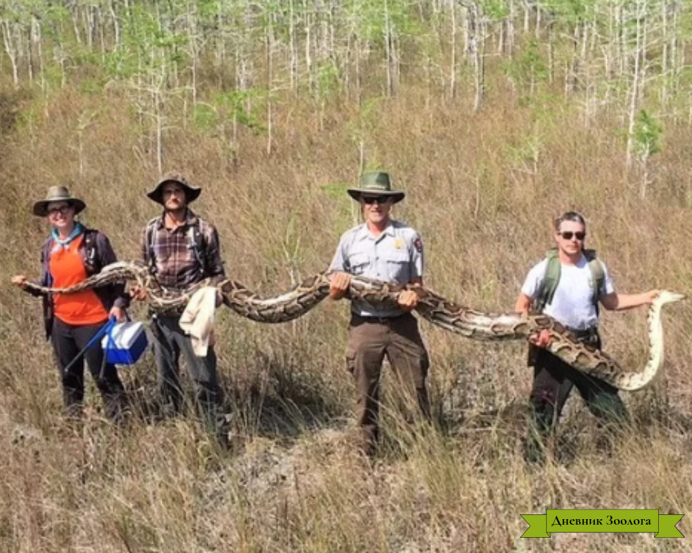 Защитники дикой природы нашли 5-метрового бирманского питона и будущую мать в Национальном заповеднике Флориды - самый длинный питон, когда-либо найденный в этом заповеднике. Вес рептилии 63 килограмма, что ставит ее в топ-10 самых больших диких питонов. Количество яиц, найденных при ней - 73. «Это намного выше среднего», - сказал исследователь в интервью Live Science. «При разведении питонов считается, что если питон принес вам 40-50 яиц, то год удачный». Овальные яйца длиной от 10 до 13 сантиметров занимают так много места внутри матери, что ей приходится прекратить есть, потому что она буквально не может ничего проглотить. Даже органы сжимаются. «Очень впечатляет», - сказал исследователь. «Это все равно, что засунуть кучу шариков в носок». Яйца развиваются в матери в течение двух-трех месяцев. Затем она откладывают их в кучку. После этого мать остается с ними, чтобы держать их в тепле. Вдобавок ко всему, бирманские питоны умеют хорошо прятаться и захватывать добычу, перемалывая все,