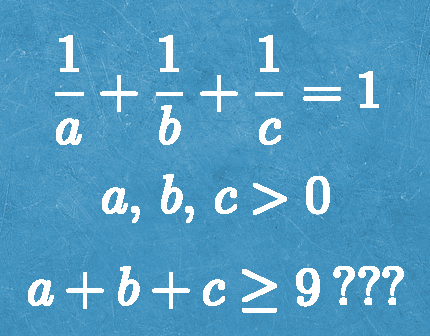 Недавно мне встретилась задача следующего вида: То есть известна сумма заданного вида и нужно доказать, что a+b+c больше либо равно 9. Числа a, b, c при этом действительные и положительные. Казалось бы задача должна решаться какими-то известными преобразованиями и не хитрыми оценками, ведь выглядит она достаточно простой. Но покрутив выражение удалось получить только оценку, что сумма больше либо равна 5, что далеко от требуемой задачи. Поэтому я решил «Выстрелить из пушки по воробьям» и описать, собственно, этот прием, потому что он может пригодиться и для других задач с оценкой. Идея: выразить сумму, как функцию одной переменной и исследовать эту функцию. Решение: пусть для определенности Мы можем выбрать a таким образом не нарушая никакие условия задачи. Как можно догадаться дальше вся сумма будет выражена через a. Мы сложили второе и третье слагаемое, затем перенесли первое в правую часть и поменяли местами числители и знаменатели в полученном равенстве. Мы можем так сделать пото