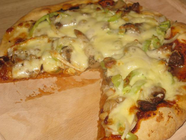 Вкуснейшая пицца с говядиной, маринованными грибами, двумя видами сыра и сладким перцем. На 1 пиццу: Тесто: 65 мл. пива гиннес комнатной температуры 1/4 ч.л. (0,75гр.) сухих дрожжей 100 гр. муки 1/8 ч.л. сахара 1/3 ч.л. соли 0,5 ст.л. оливкового масла Начинка: 1/4 стакана томатного соуса (кетчупом или томатной пастой не заменять) 180 гр. филе говядины 65 мл. гиннеса 1/2 шт. репчатого лука 1/2 сладкого зеленый перец маринованные шампиньоны 1/2 стакана моцареллы 30 гр. чеддера красный перец хлопьями Как всегда начинаем с теста. Пиво немного нагреваем. Муку, сахар, дрожжи, соль смешиваем в отдельной миске. Добавляем теплое пиво, оливковое масло, замешиваем тесто. Смешиваем насадкой крюк на низкой скорости 4 минуты. Расстойка 5 минут. Затем вымешиваем 2 минуты на средней скорости. Делаем "windowpane test" (Этот шаг обязательный. Если тесто тест не прошло, вымешиваем еще). Шарик теста смазываем оливковым маслом, убираем в пакет. Расстойка теста при комнатной температуре 1 час. Пока тест