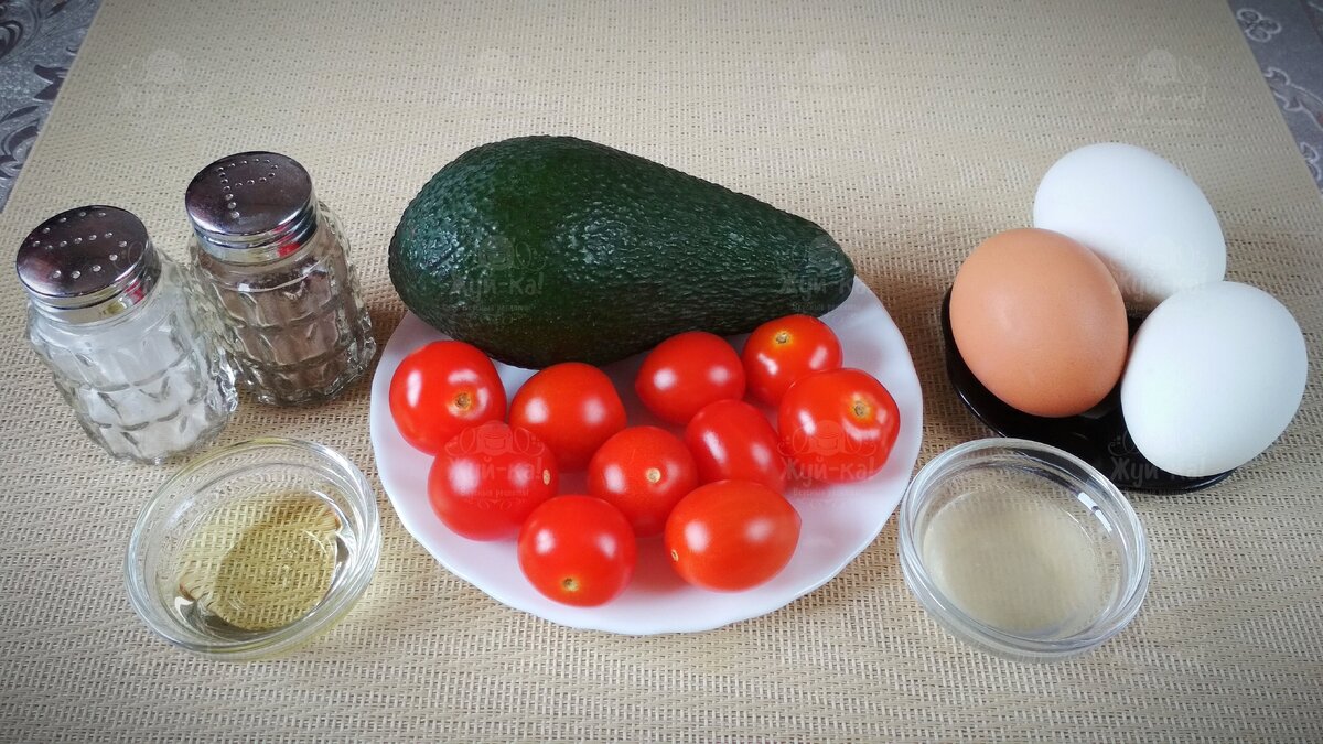 Готовим лёгкий салатик - он идеально подходит для тех, кто следит за своей фигурой! Ведь авокадо содержит большое количество белка, который наш организм усваивает гораздо проще, чем белок из мяса. Ингредиенты: · Авокадо – 1 штука · Помидоры черри – 150 грамм · Яйца – 3 штуки · Сок лимонный – 2 столовые ложки · Оливковое масло – 1 столовая ложка · Соль, перец – по вкусу Способ приготовления: Овощи и яйца моем. Авокадо разрезаем вдоль, вынимаем косточку, очищаем от кожуры и нарезаем ломтиками: Обратите внимание на спелость вашего авокадо. Если он недозрелый, то мякоть будет твердоватой и нарезать в этом случае нужно небольшими кусочками. А если авокадо спелый, то нарезаем ломтиками побольше: Как выбрать спелый авокадо можете посмотреть тут Помидоры черри разрезаем на четвертинки: Яйца отвариваем, чистим. Натираем их на средней тёрке: Смешиваем все ингредиенты, солим и перчим. Добавляем лимонный сок и оливковое масло. Хорошо перемешиваем и подаём
