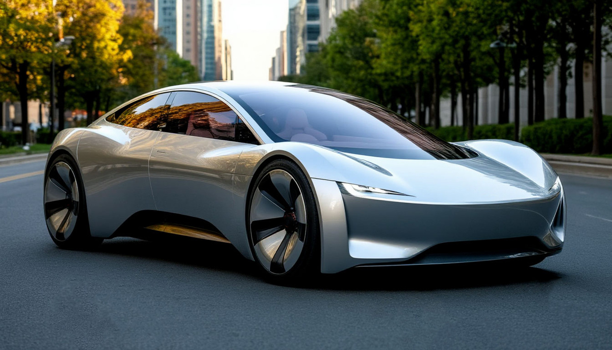 В нём три ряда кресел, которые можно удобно повернуть к себе при посадке, как офисный стул на колёсиках. Автомобиль в режиме управления «автопилот» позволяет опустить сиденья практически в горизонтальное положение. Обивка сидений выполнена из экокожи, и органических соединений, при производстве которых использовались яблоки, пол деревянный, на руле – сенсорный переключатель передач. Другие элементы управления отсутствуют. Дальность поездки без подзарядки - до 450 км. Общая мощность - 306 л. с.