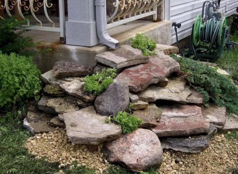 Многие сегодня сооружают нагромождение из камней под водосточной трубой. Это не просто альпийская горка. Камни в данном случае выполняют сразу несколько функций. Давайте вместе подробно изучим этот вопрос! Первое - камни защищают грунт от вымывания. Струя воды способна за годы сделать промоину в области водостока. Разбиваясь о камни, она плавно уходит в землю. Второе - экономия. Просто положить камни намного дешевле, чем проектировать, сооружать и обслуживать колодец для приема дождевой воды. Некоторые отводят воду в септик. В итоге после дождя приходится вызывать ассенизаторную машину. Третье - декоративная функция. Во время дождя каменная горка превращается в живописный водопад. Тут надо сказать, что не все делают горку. Некоторые наоборот, формируют углубление. Благодаря этому после дождя на участке появляется мини-пруд. Потом вода впитывается, и никаких проблем с уходом за водоёмом нет! Можно возразить, что дождевую воду лучше всего собирать и использовать для полива. Но если