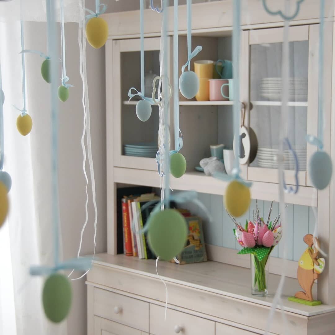 Я всем рекомендую, если вы хотите дома праздник, хотите по-настоящему добавить праздничной атмосферы, начните продумывать декор именно с верха. Декор, который расположен на уровне глаз (а именно на этом уровне оказывается верхний декор, когда мы смотрим на него издали) моментально привлекает внимание. У меня есть разные хитрости для крепления декора под потолком. Для потолка в гостиной есть специальные петельки на стенах, к которым я могу привязать всё, что хочу. Для декора над столом мы повесили несколько рядов лески. Ее абсолютно не видно без декора, поэтому мы её не снимаем. Именно на неё я повесила сначала яйца на лентах, а потом ещё и пару гардин Лилль из Икеа. Её я давно купила давно для различного декорирования. Деревянные яйца я покрасила акриловой краской. Голубая - benjaminmoor icy